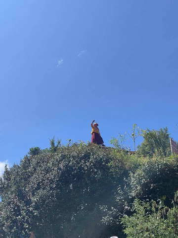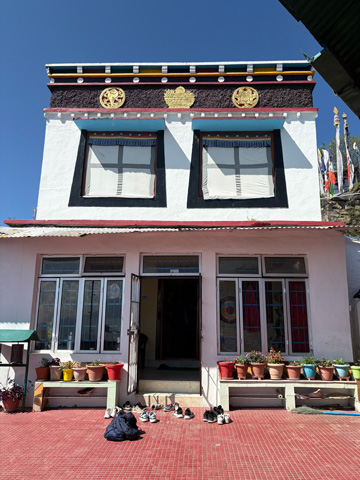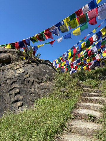 頭上には、青空にタルチョ(祈り旗)がはためいている。